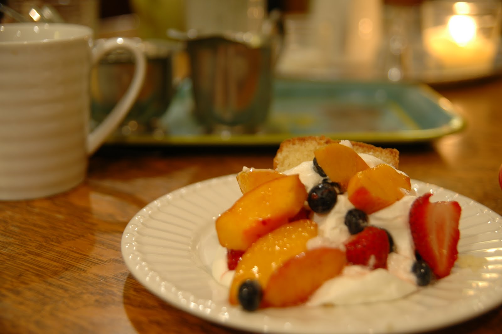 and for dessert: sour cream pound cake topped with fresh berries, peaches and whipped cream (and a good cup of coffee)
