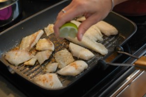 Cook at medium high until edges turn white, then flip. Squeeze lime juice on fish. Cook until white throughout and flaky. Break into pieces.