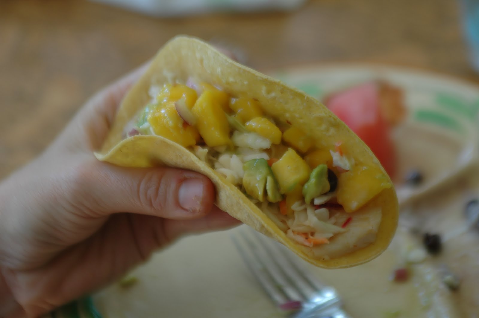 To Assemble: Heat Corn Tortillas, add fish, then top with slaw and mango salsa. Enjoy!