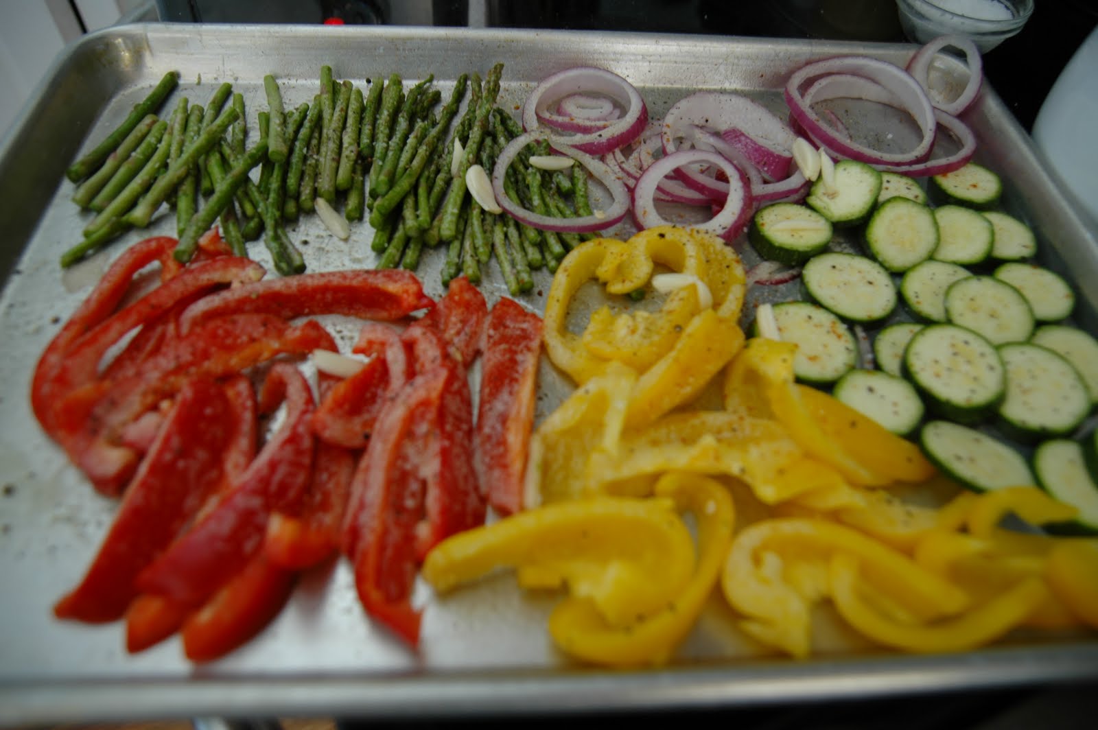 Roasted Veggies – Use whatever vegetables you like or have on hand- our favorites are asparagus, red bell pepper and zucchini. Clean and cut veggies into large pieces (they will shrink) toss in olive oil (unless I’m being REALLY good and then I spray Olive Oil Cooking Spray on them and toss) and sprinkle with kosher salt and fresh ground pepper. Then place on a greased baking sheet and cook at 400 degrees until tender, tossing ½ way through (about 20-30 minutes depending on the vegetables you choose).