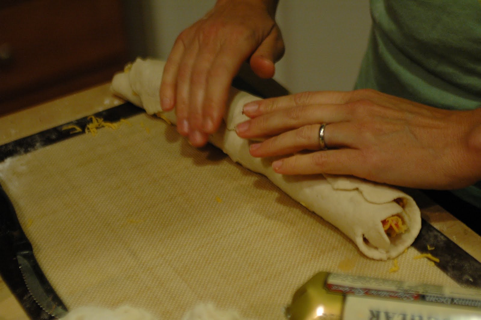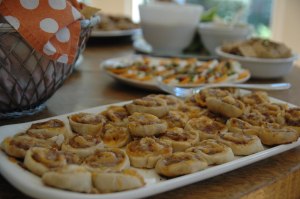And I decided to make Sausage Pinwheels, in honor of the male attendees. Guys love them. (My guys – Asher (my son) and Dave (my husband), confessed to have eaten a dozen each). To me they are a prettier version of sausage balls…and a little harder to “pop in your mouth” which helps to stretch them. I always say that people will eat as many as you serve.