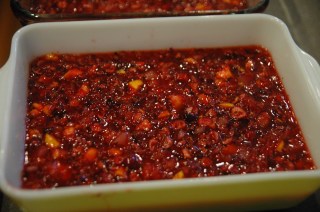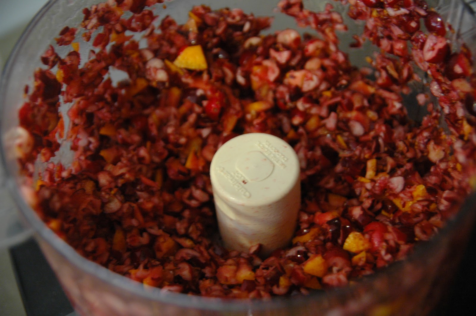 Grind 1 bag of fresh cranberries and a whole orange (with rind) in the food processor.