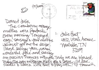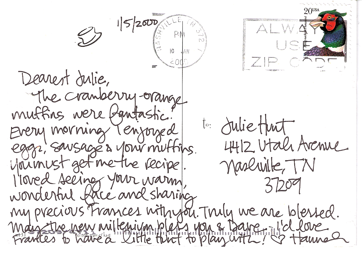 Years ago, when my friend Hannah had her baby Frances, I wanted to take her a tasty baked good and squeeze that little girl. I found a cranberry orange muffin recipe in a Martha Stewart cookbook, whipped them up, and took them over to her. Hannah is one of the most lovely gift recipients! She expressed her gratitude on the spot. Then a few days later I received this postcard from her.