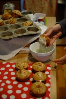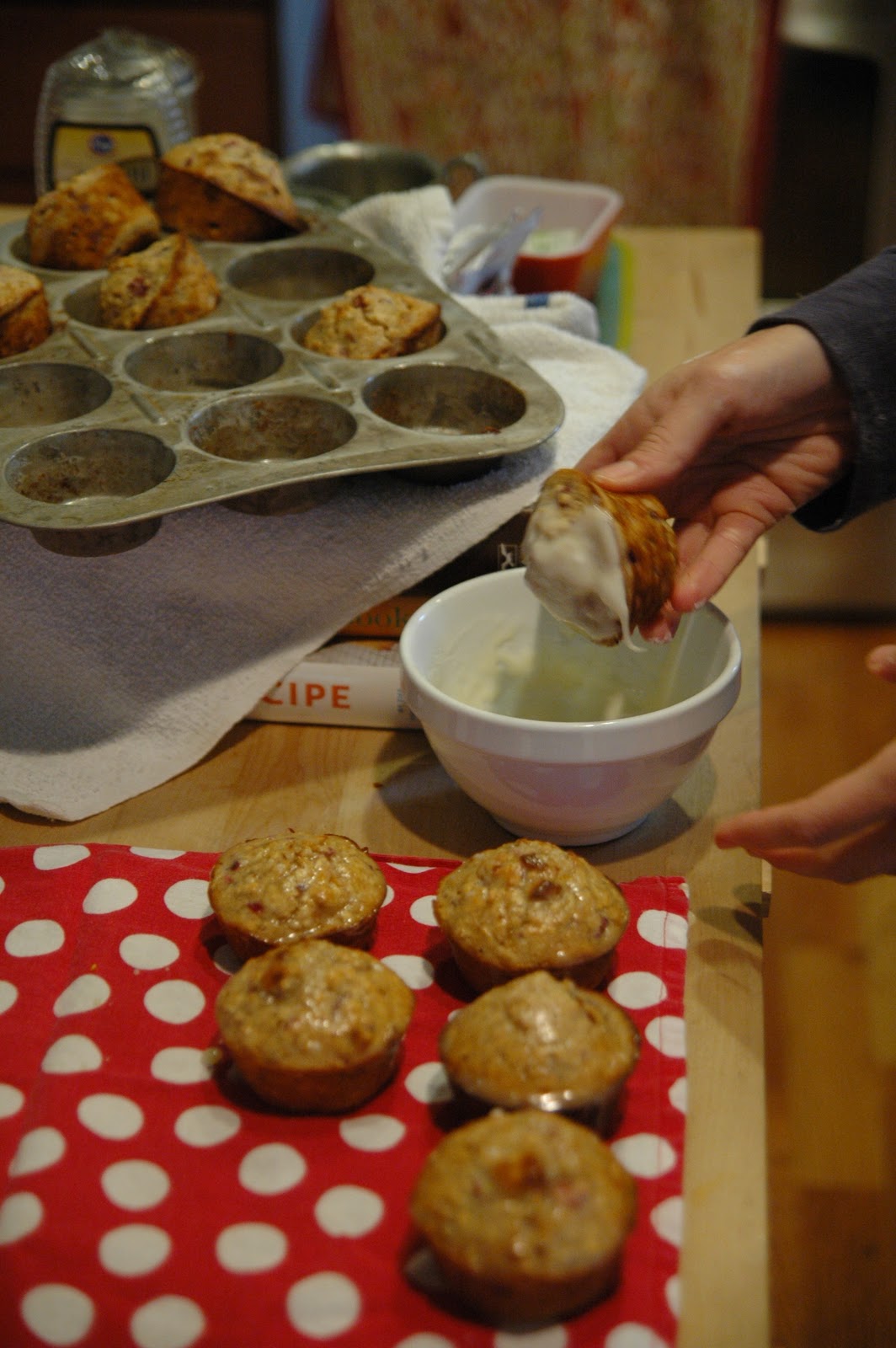 Bake in 375 degree oven for 16 to 18 minutes, until they are golden. Remove from oven, leave in pan for 5 minutes. Stir glaze ingredients together, adding powdered sugar and orange juice to get the desired thickness. Dip the tops of the warm muffins into the glaze.