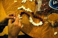 • String cranberry and popcorn garlands with a little air popped corn, some fresh cranberries, dental floss and a sharp thin needle.   We have a garland which has lasted for over 10 years.  The cranberries are dried, and obviously not edible but are pretty (just a little wrinkly, but that’s what happens over 10 years…my face can attest to this!)