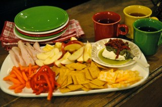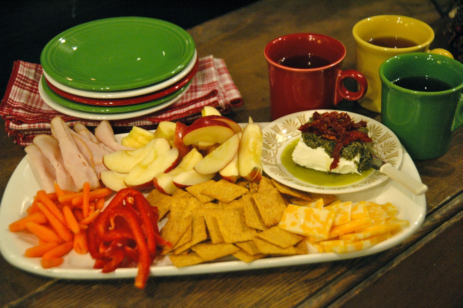 • Have a snacky meal- I took ½ a block of light Cream Cheese and topped it with a few spoons-full of bought/jarred pesto and a handful of sun-dried tomatoes served with Wheat Thins for our “main dish” and Colby/Jack cheese slices for the kids, raw veggies, apple slices and some deli turkey slices.  Easy, quick, pick up as you decorate, done.  All food groups represented.
