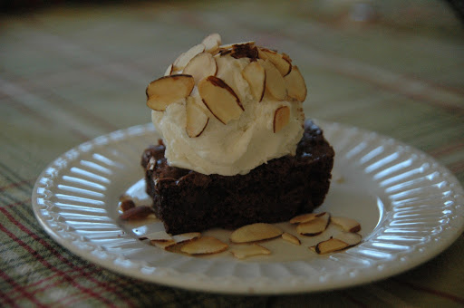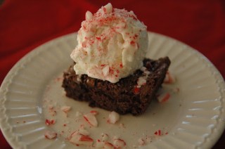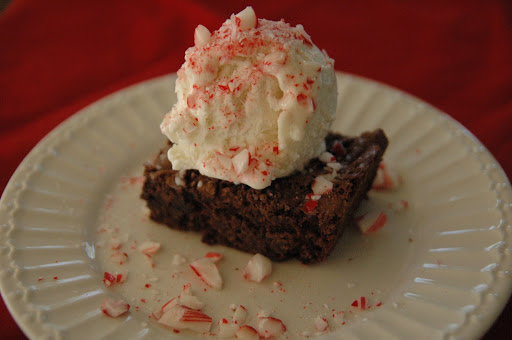 I made Lane's brownies last night! I used the 2 cups of choc. chips melted in, but for the 2 cups to stir in at the end I used a bag of chopped up Andes mints. Yummy!!! Now I just need that peppermint ice cream to go with them…