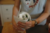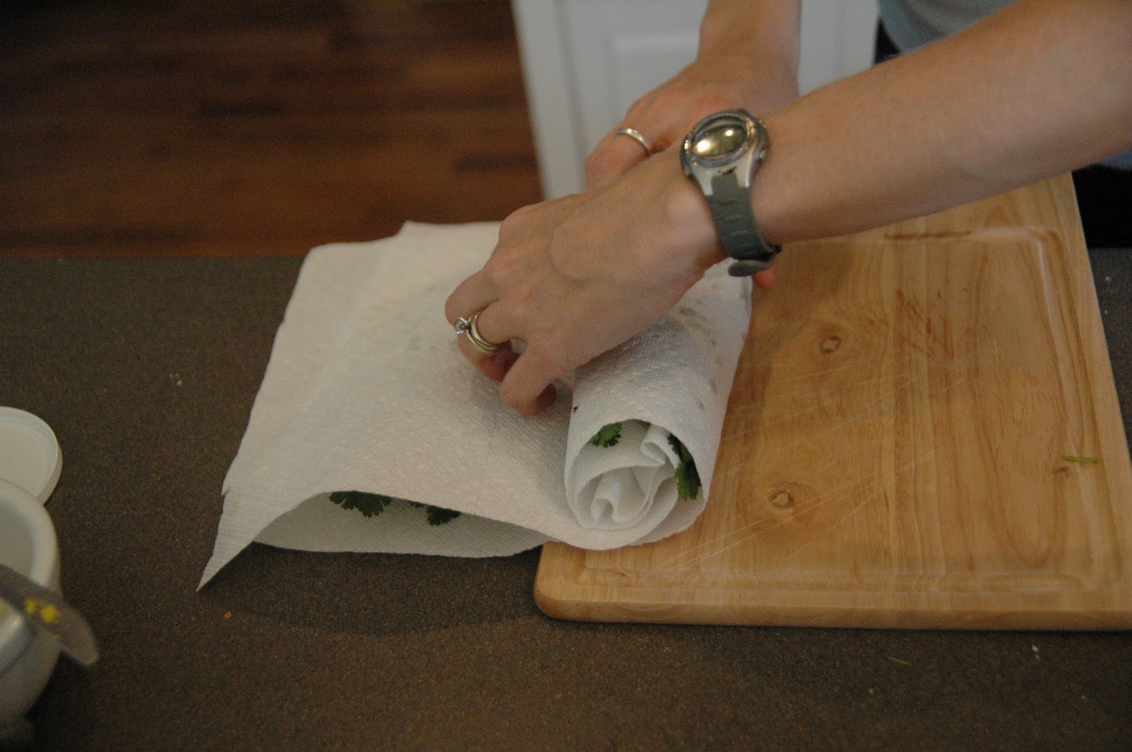 Melissa B. and I have a practice of sharing some of the onions and cilantro we have leftover with each other so that they don’t go to waste. I love this quality in a friend- the produce-sharing quality. She taught me this great tip for extending the life of greens…to lay them onto paper towels and loosely wrap them, then store in a large ziplock bag.