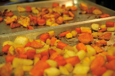 This season I have been making varieties of Roasted Winter Vegetables. In Ina’s original recipe she uses butternut squash, carrots, sweet potatoes and white potatoes. It is beautiful and lovely. I realized, however, that in this mix the squash is my family’s least favorite. It is also the most labor intensive to prep and most expensive to purchase. I began to omit it. Sometimes we just roast carrots, sometimes just new potatoes, at times only sweet potatoes. This past week I roasted white and purple potatoes and sweet potatoes, and they were gobbled up by all…even my persnickety eaters. I usually serve them with a dollop of sour cream, though my kids sometimes prefer a little ketchup or even some brown sugar with those sweet potatoes.