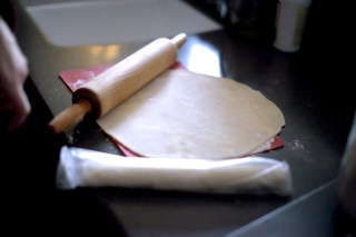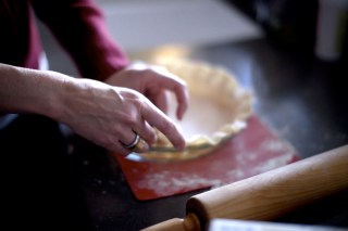 Start with the pie crust and follow the directions on the box for prepping it. I slightly roll it out on a floured mat to give it ample room to hang over the pie lip.