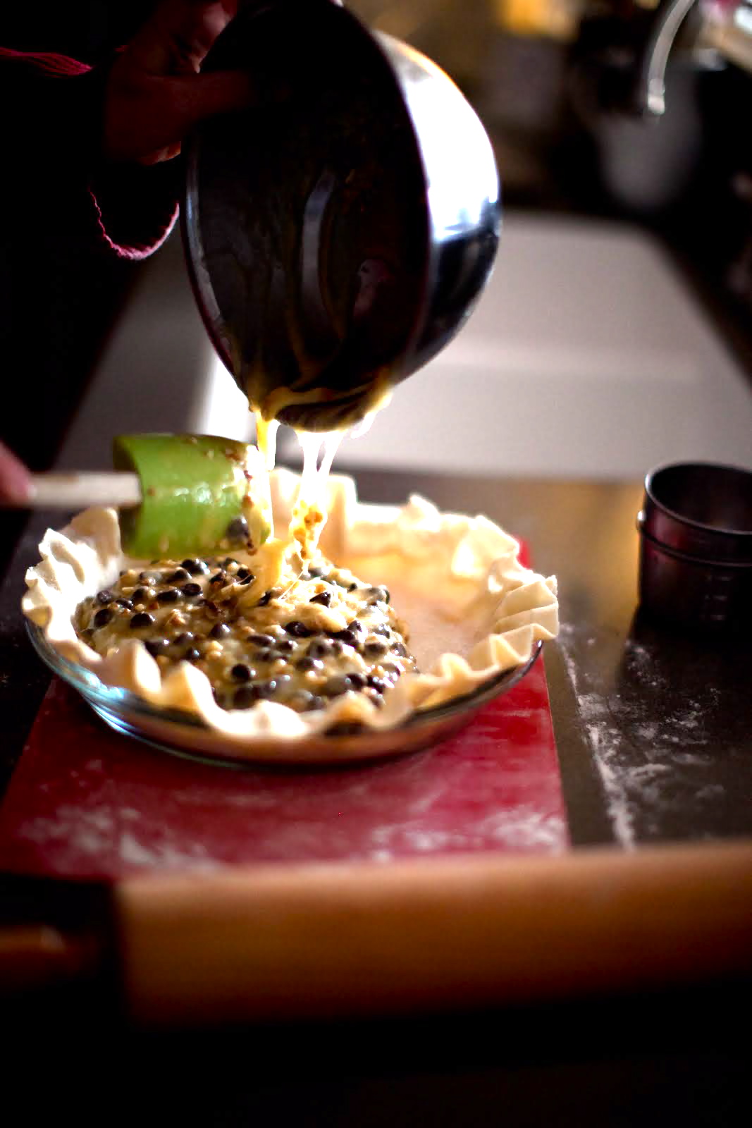 There’s really nothing novel about the pie. You have probably had it many times at potluck dinners or grama’s house. I don’t know what you call this pie. Chances are it’s probably not We’re Having A Baby Pie or Sweet Lucy Pie. Maybe Derby Pie, Kentucky Derby Pie or Chocolate Chip Pecan Pie. I sometimes call it Chocolate Chip Pie in front of my kids, hoping they won’t notice the pecans, which they think they don’t like. Any way you name it, it is simple and tasty, a crowd pleasing southern classic.It’s great warm or room temp with a big scoop of vanilla ice cream on top.