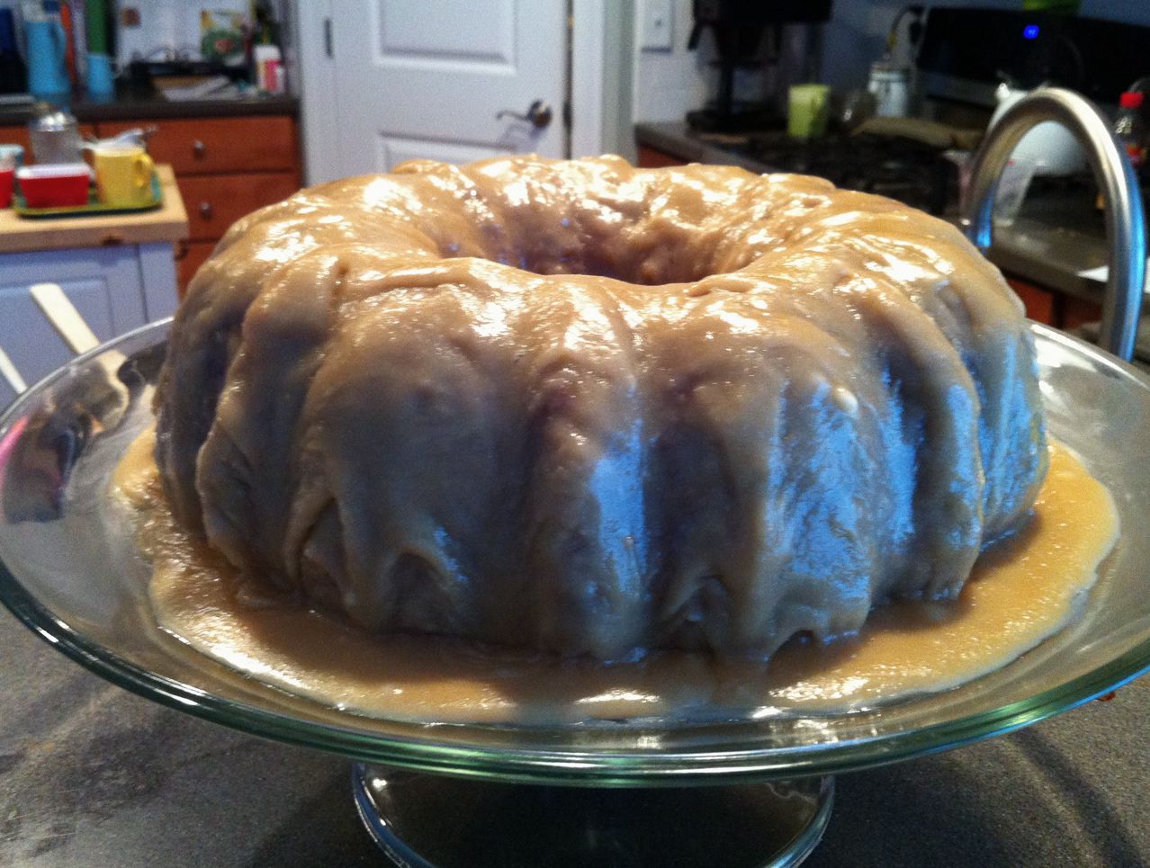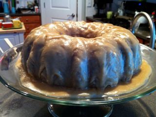 When I left Goodwill, with a few found treasures in hand, I came out to find snow pouring down! I carefully drove home. When I arrived, I stepped inside and, much to my surprise, immediately smelled the glorious aroma of buttery baked goods. I walked down the hall expecting to see cookies that Dave must have had a craving for. But instead when I got to the kitchen I saw the beautiful caramel iced pound cake placed on top of our glass cake plate. I was astounded! Happy Birthday to Me!