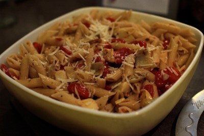 This recipe is my adaptation of the Everyday Food magazine recipe.  It originally included kalamata olives, which we omit and substitute with artichokes- since my eaters are more artichokey than olivey.  The olive oil and tomatoes ARE the sauce, so you may want to add more stuff to it or lower the ratio of pasta.  Make it your own.  It’s just a simple and really tasty go-to pasta that is a crowd pleaser.
