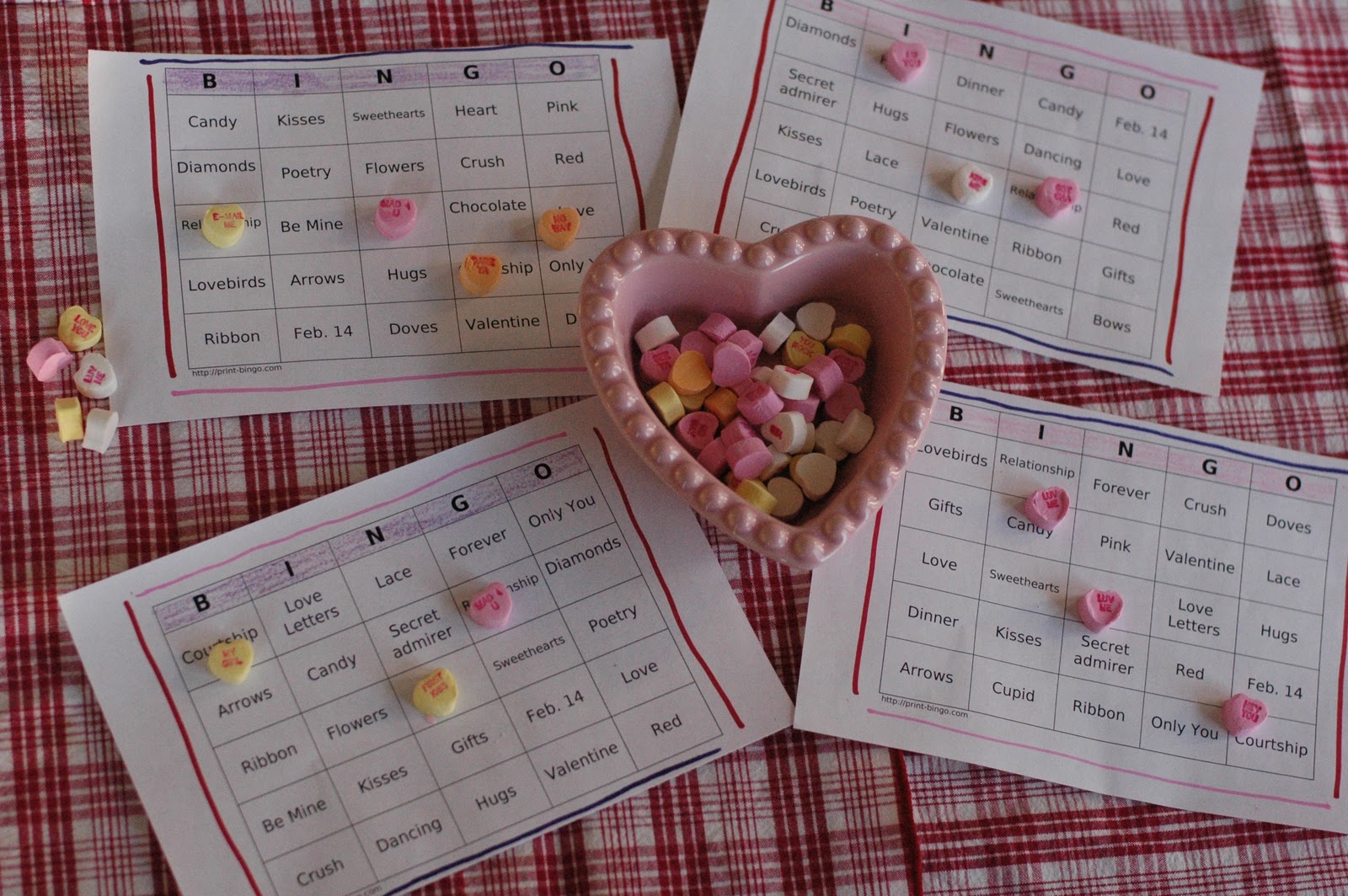 Conversation Heart BINGO – Sometimes we play BINGO with conversation hearts as the chips. It’s fun, spans all ages and you can eat as you play! I found this clever website where you can download bingo games for free. They have various holidays and themes, and you can even customize them.