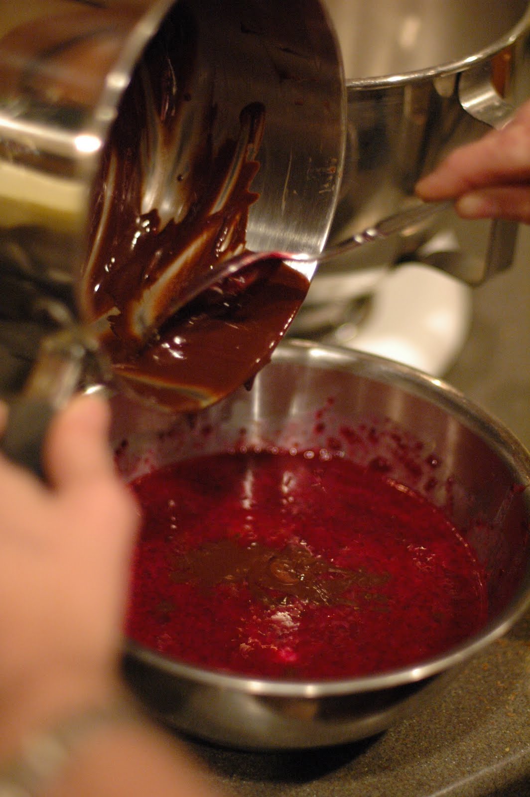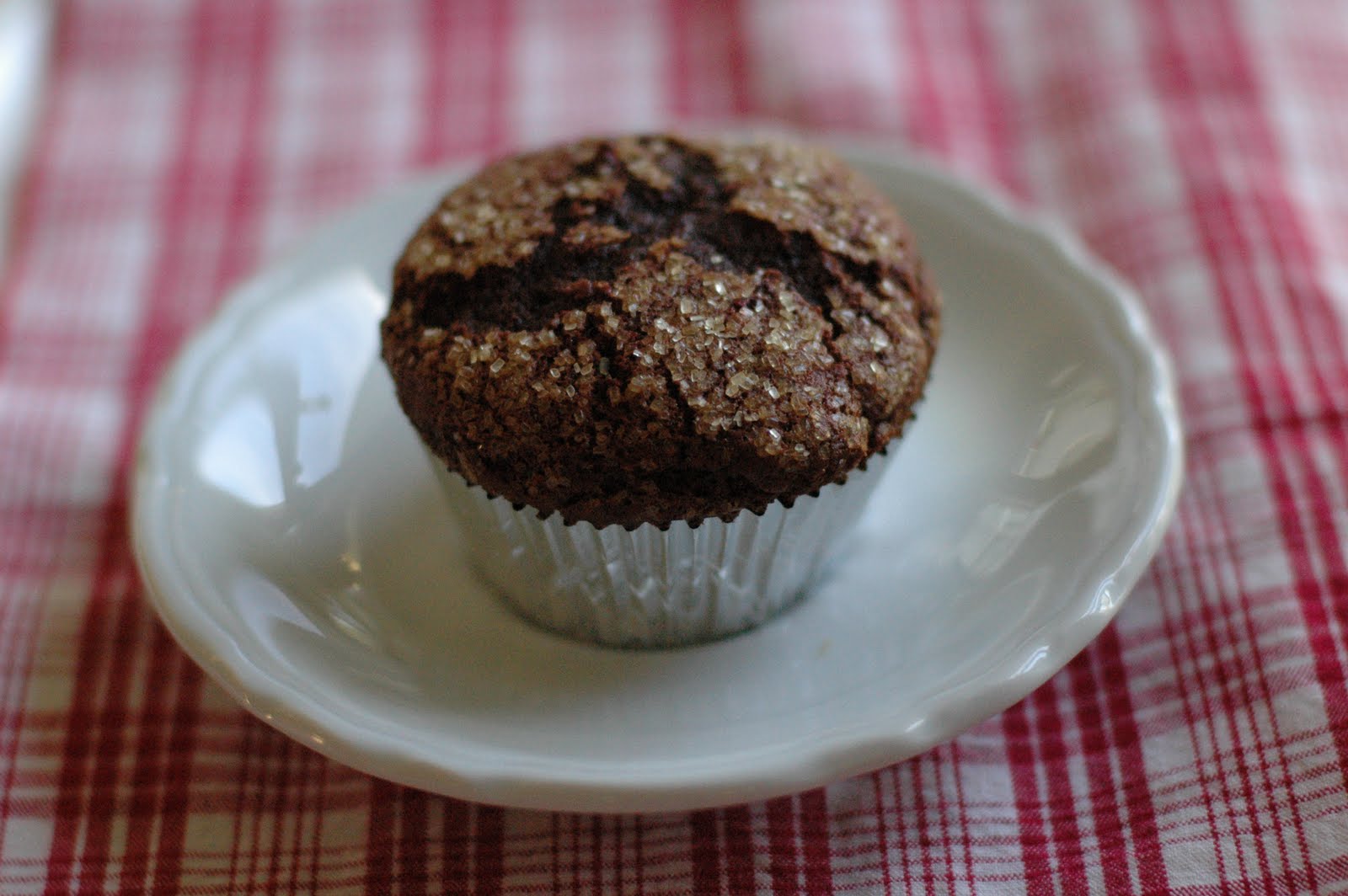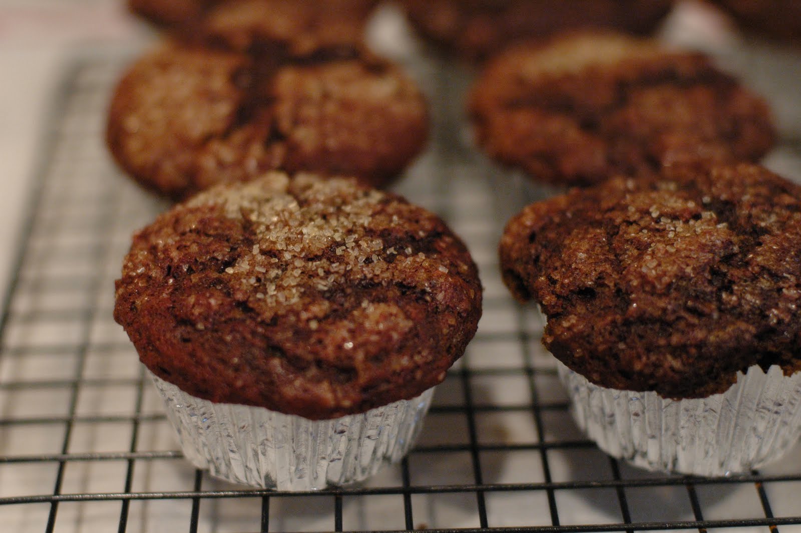 Pour the chocolate mixture into the dry ingredients and stir with a wooden spoon until just combined. Don’t over mix. Immediately spoon batter into 12 lightly greased paper lined muffin cups.