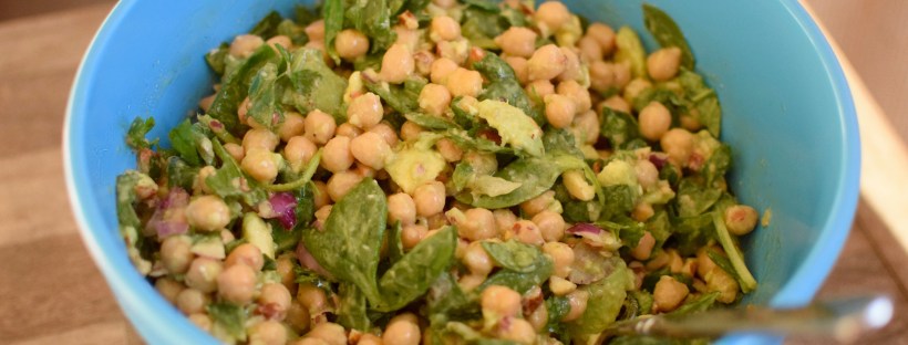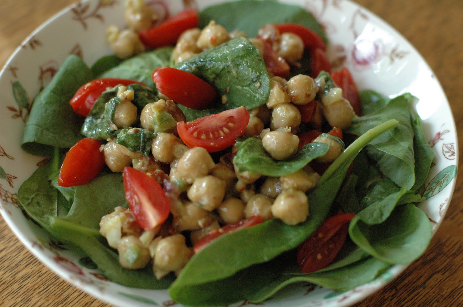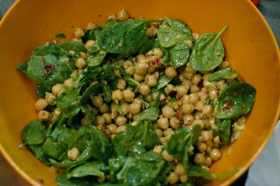 Toss the dressing into the chickpea mixture and blend well.  Add the spinach leaves. Combine well to coat.