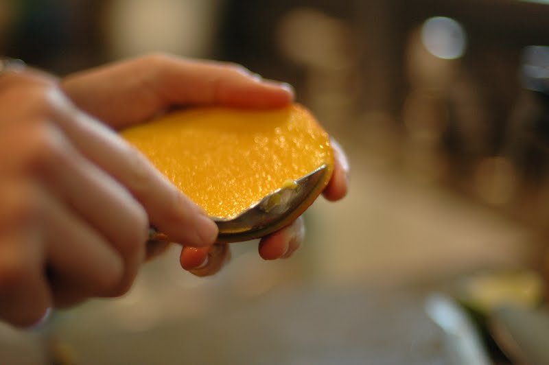 Using a large spoon, move around the edge of the fruit between the peeling and the meat to separate the fruit and scoop it out.