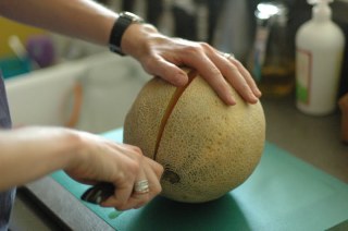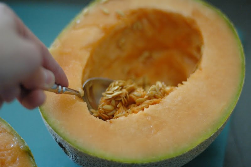 Cantaloupes are a little tricky to select because the ripeness is not very obvious. You want to avoid one with soft, mushy places. The outside should be a little able to “give” when held in your palm and gently pressed.  You want to look for melons that are golden in color, not green.  The other clue is the belly button. Smell this spot.  Oddly, the smell you are going for is not a good smell or even a cantaloupe smell, but rather a kind of sweet, musky scent.  If there is no smell at all it is probably not ripe or flavorful.