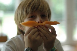 My kids love when I cut it with  “handles” (with the rind still on).  There are pros and cons to this.  The pros are that it requires no silverware, it’s less messy and it’s fun.  The cons are that it takes up lots of room on your plate,  lots of room in your container or dish and you have to deal with the left-over “handles” once they have been eaten.