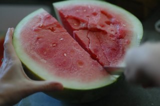 The outside of watermelons is pretty consistent.  I give it a good look all over to make sure there are no bad spots, give it a good thump and listen for a thud- a hollow sound- to make sure it’s full of juice and then take it home!  I find that watermelon is much easier to store once cut up (as it is so large and cumbersome), but as soon as you cut it up, it loses some life expectancy.  Sometimes I slice it in ½ and cut up one ½ to keep in a container (or eat immediately) and leave the other ½ intact.