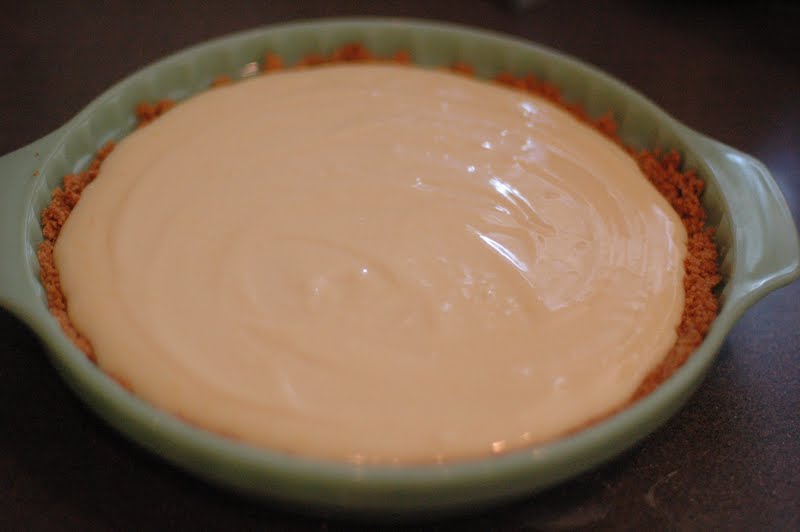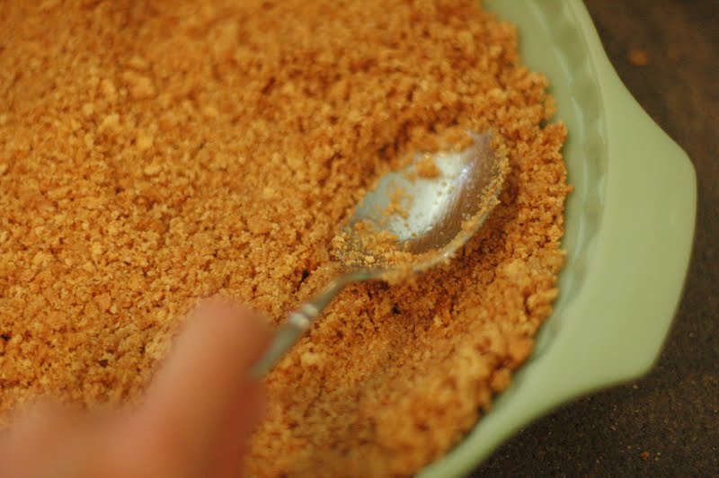 Make Graham Cracker Crust – I put graham crackers in a ziplock bag and crush them with my fist, or with a mallet. (You can make them as fine or coarse as you like). Stir together ingredients for the crust. Combine until well incorporated. Press into a lightly greased pie pan – reserving one spoonful for tasting (okay, you don’t have to, but I can’t ever resist!) Place crust into oven and bake for 10 minutes at 350 degrees.
