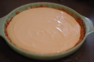 In a separate bowl, combine all of the ingredients for the filling. Stir until consistent and smooth. (Hang on to the egg whites, as you can use them in another recipe or have them on hand for breakfast egg whites). Pour filling into crust. Return to oven for 10 minutes (just to “kill” the raw egg). Let sit on counter for 10 minutes to cool a bit. Place in refrigerator for 4 hours or more – until set and cold.