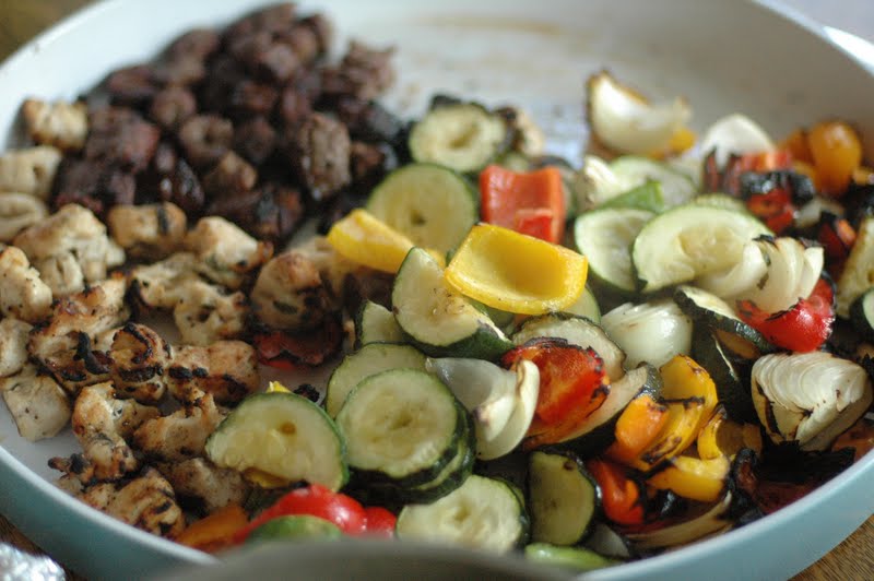 If you use wooden skewers (which are good if you don’t have enough metal ones or you don’t own any metal ones) it is imperative that you follow the instructions on the package about soaking the skewers before using them on the grill. Trust us, we learned the hard way.