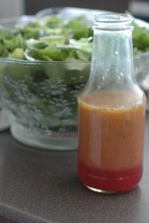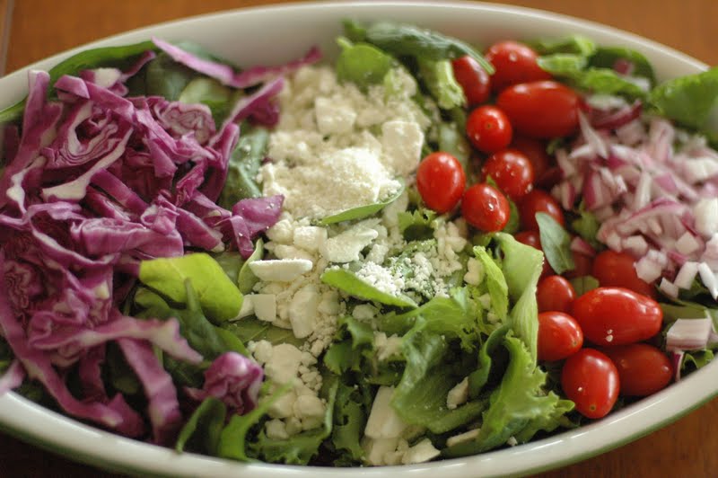 For my Greek Salad, I included Romaine Lettuce, Shredded Purple Cabbage (from my mom’s neighbor’s garden), grape tomatoes, diced red onion and Feta (of course).