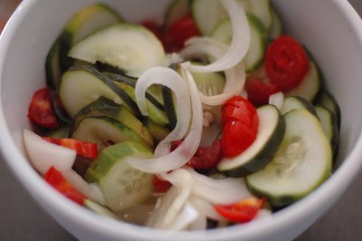Thinly slice cucumbers and half tomatoes. Thinly slice onion. Add vegetables to marinade and toss together.