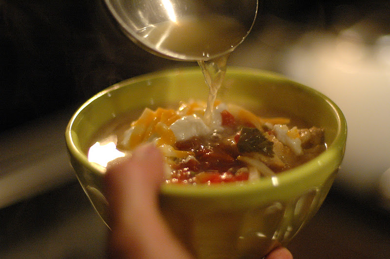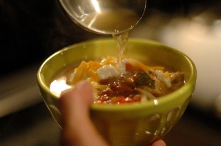 A couple of years ago I went to a Mexican Cantina and ordered their Chicken Tortilla Soup. When the meal arrived, to my surprise, I was served a plate with a bowl that contained rice, beans and chicken in it and a spread of fresh ingredients beside it on the plate including diced tomatoes, avocado slices, pico de gallo, and shredded cheese. The broth was brought in a pitcher and was poured over the ingredients in the bowl at the table-side.