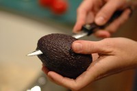 | Using a sharp knife, cut a lateral line through the center, cutting around the large center pit |