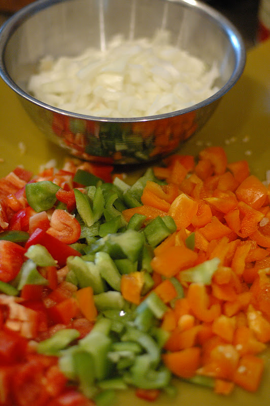 Chop peppers and onions.  Drain and rinse beans. Heat olive oil in large pot on stove top.