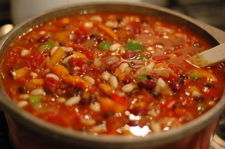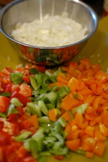 So last winter I decided to try to create a Vegetarian Chili recipe that would be so yummy that meat-lovers wouldn’t even miss the meat.   I recall making Barefoot Contessa’s Chicken Chili from her Parties Cookbook, which calls for an unbelievable 8 cups of onion and 8 cups of peppers in the recipe and and it is delicious!  So I decided to start with gobs of onions and peppers and improvise from there.