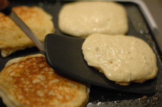 Pour blobs of batter onto griddle.  When the edges start to come up, and bubbles form on the wet side, flip.