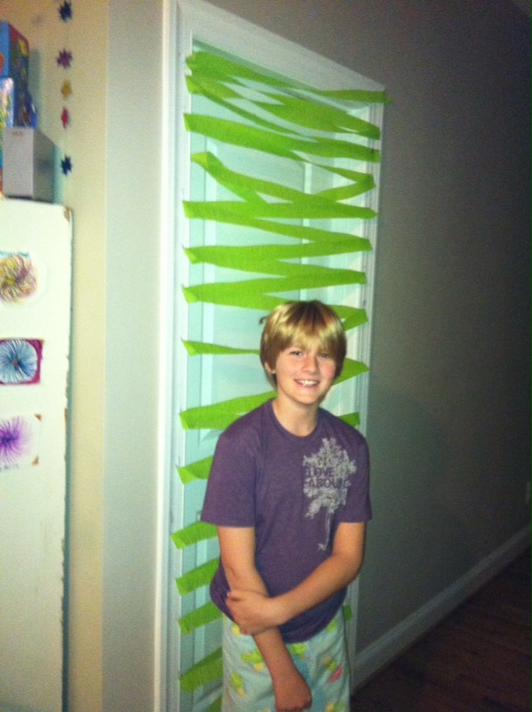 We put streamers all across his door, early in the morning, so that he woke to a streamer-web.  My thought was that he would bust through in the morning, as a passage of entering into his double digits of life!  To my surprise he said, “WOW! This is cool!” and got on the floor and shimmied UNDER the web on his belly, as he didn’t want to mess it up.  I didn’t see that coming! And during his party, with boys in and out of his room, they were all crawling their way in under the streamers.