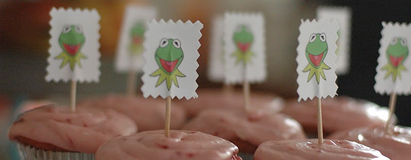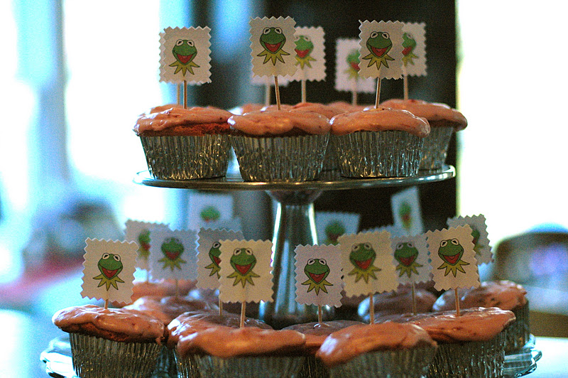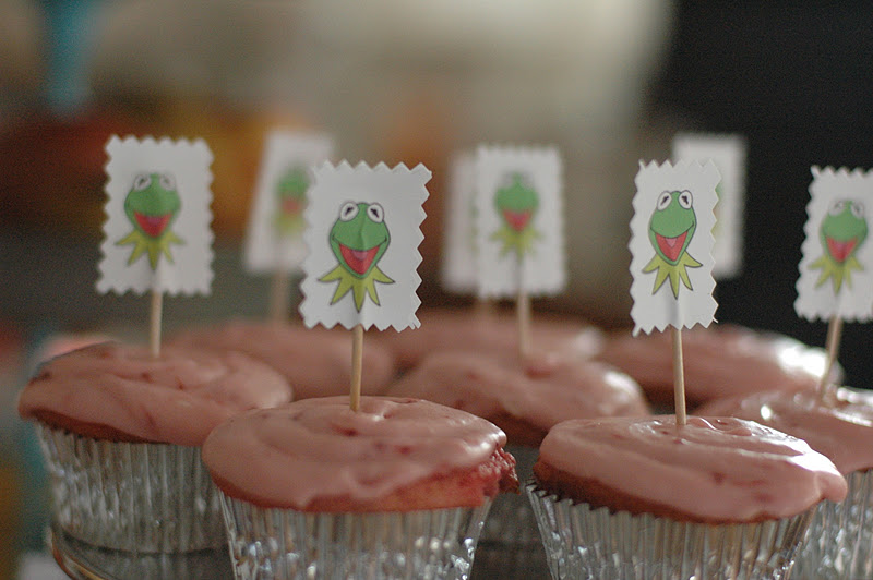And they returned home for pizza, fruit kabobs and strawberry cupcakes (read HERE if you want the history of my son and strawberry cake).  This year I attempted to bring the theme into the cupcake by making these little Kermit toppers with an image I found online.  It was funny to see 24 little Kermits sticking out of pink cupcakes.
