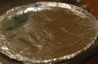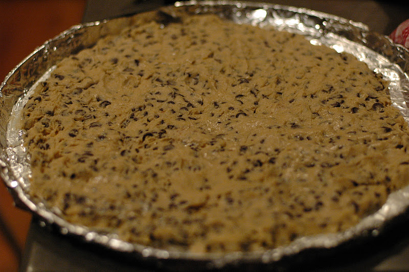 Making the cookie is so easy.  I made it in a pizza pan.  I lined it first with aluminum foil, (main reason being that my pizza pan has holes all through for even-pizza-baking, and I didn’t want gooey cookie dough oozing out of the holes).  Of course you can use a rectangular jelly-roll pan instead.