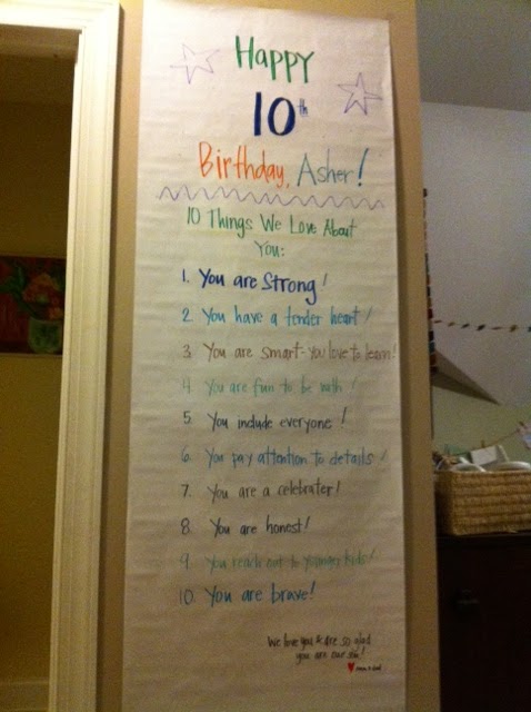 We also made a sign of 10 things we love about him on his 10th birthday on butcher paper to hang on the hall wall outside his room.  (We saw this idea on Pinterest too).  It was really fun to make and fortunately, it was not hard at all to come up with 10 qualities that we love about him.