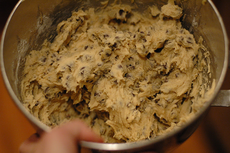 I use the basic Toll House Chocolate Chip Cookie recipe that’s printed on the back of the yellow chocolate chip bag.  I make one alteration, that originally my friend Melissa B. suggested.  Instead of the ¾ brown sugar, ¾ white (granulated) sugar, I usually use 1 cup brown and ½ cup granulated.  It just gives it a little more toffee-like flavor.