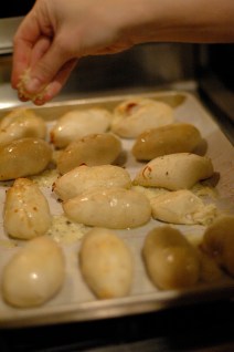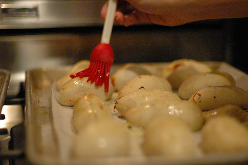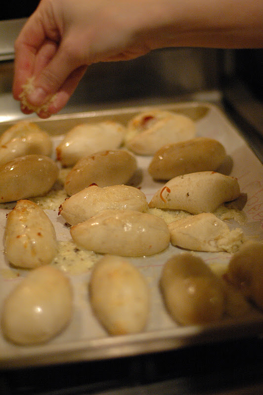 Bake until golden. Remove from the oven and brush with melted butter and sprinkle with Parmesan cheese.