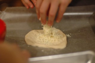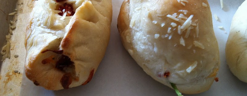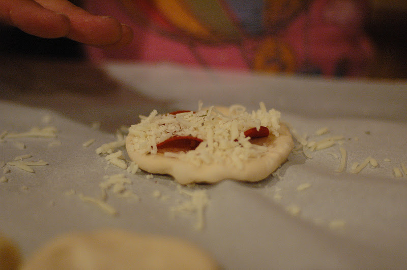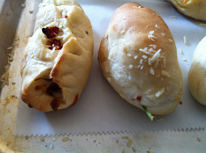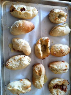 Sprinkle with pizza cheese (mozzarella, or whatever you like), Italian seasoning, and whatever toppings you like (spinach and sun-dried tomatoes/ pepperoni/ ham/etc.) Fill them as full as you can, so that the bread doesn’t dominate them.