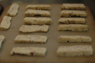 Preheat oven to 325 degrees. Remove dough from freezer. (If it has been in the freezer a long time, let it sit at room temperature 30 minutes so it slices without crumbling).