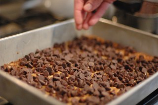 Remove pan from oven and sprinkle chocolate chips evenly over the warm bars.