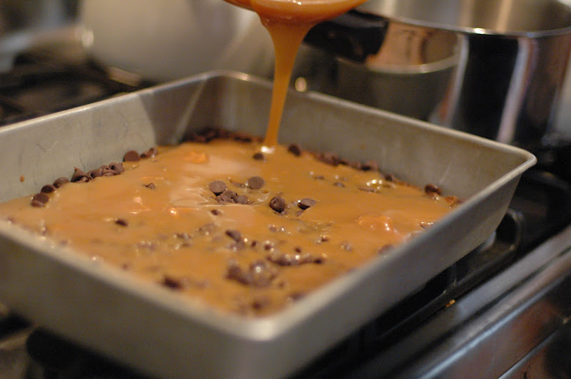 Pour melted caramel over chocolate chips.