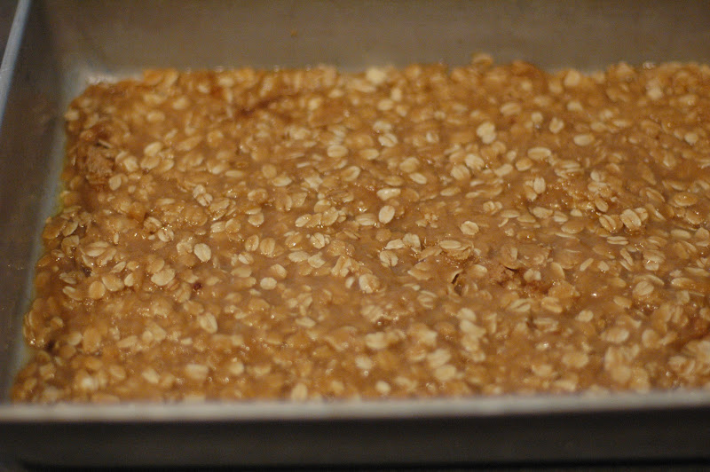 In a bowl, combine melted butter, brown sugar, flour, oats, and baking soda.  Pat half of the oatmeal mixture into the bottom of a lightly sprayed 8 x 8 pan.  Bake at 350 degrees for 10 minutes.