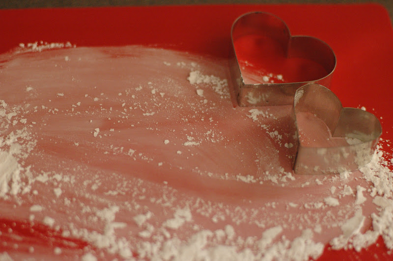 Dust cutters and rolling pin with powdered sugar. Cut out cookies in desired shapes.