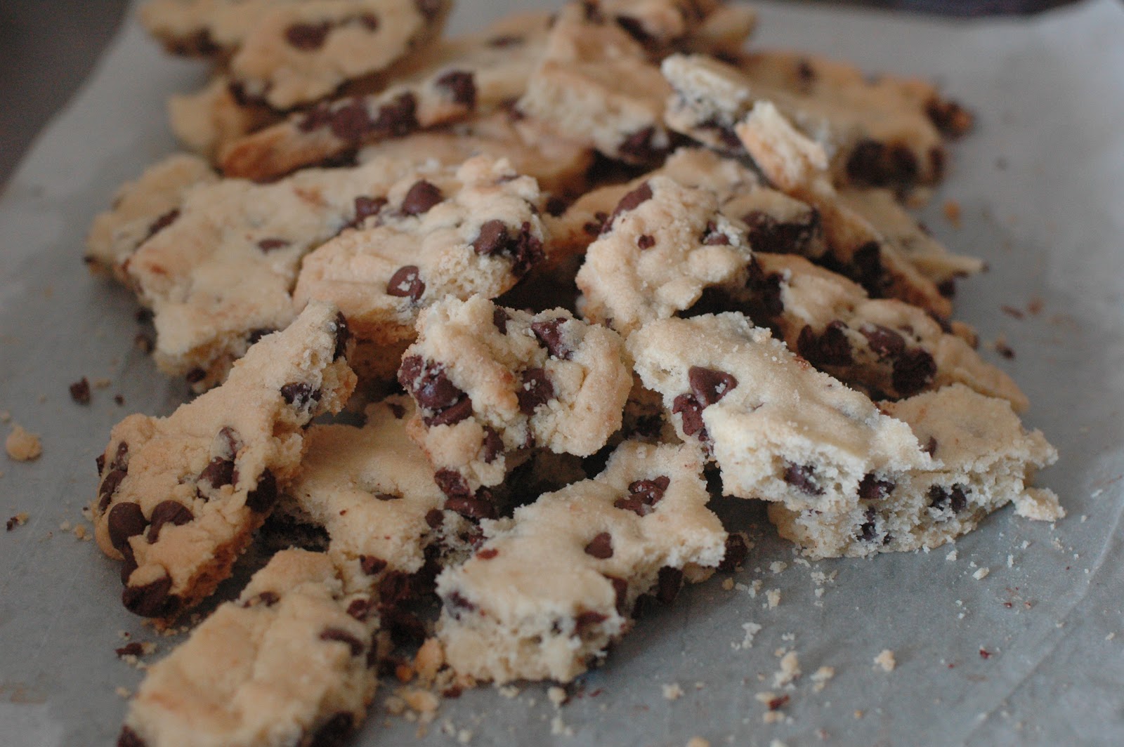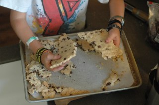 Cookie Brickle though . While the name Break Up is accurate, as it’s a cookie that you “break up”, I think it’s a downer name for such a great cookie! Who wants to eat a break up? I try to avoid break ups in my life. I renamed it Cookie Brickle a few years ago. It looks like a chocolate chip cookie, but broken into pieces. However, it’s texture is crunchy and is very buttery tasting – reminescent of toffee. Brickle reminds me of Butter Brickle Ice cream, which is toffee flavored and the definition of Brickle is “easy to break”. So…Cookie Brickle it is . It’s super yummy and because the pieces are broken you feel justified in eating a little piece, and another little piece, and another…