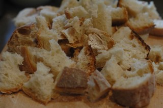 After reading An Everlasting Meal this spring, I wanted to try making croutons. I have made crostini for bruschetta many times, but it’s been a long time since I have made croutons. Since reading this thoughtful book, I’ve been putting any stale crusty bread in the freezer sealed in a ziplock bag labeled “STALE”. So this week I let it thaw on the counter and coarsely chopped it and made some croutons.