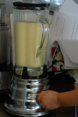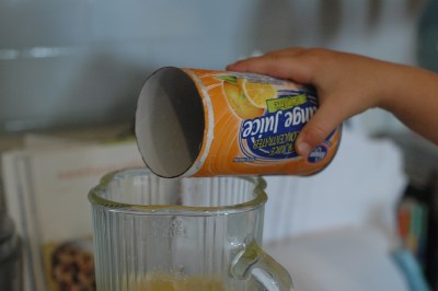 Place the concentrate in the blender, fill the empty can with ice and then water. Pour into blender. Follow instructions on the can as to how many cans are needed – simply use ice and water instead of just water. Usually it calls for 3. In that case, I add 2, blend until smooth, and then pour ½ of the liquid into a pitcher, and then add one more can of ice/water to the remaining o.j. and blend.
