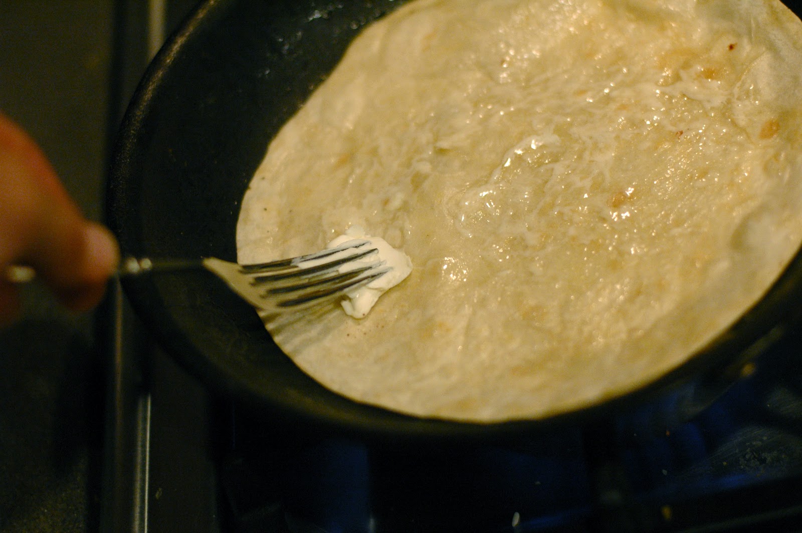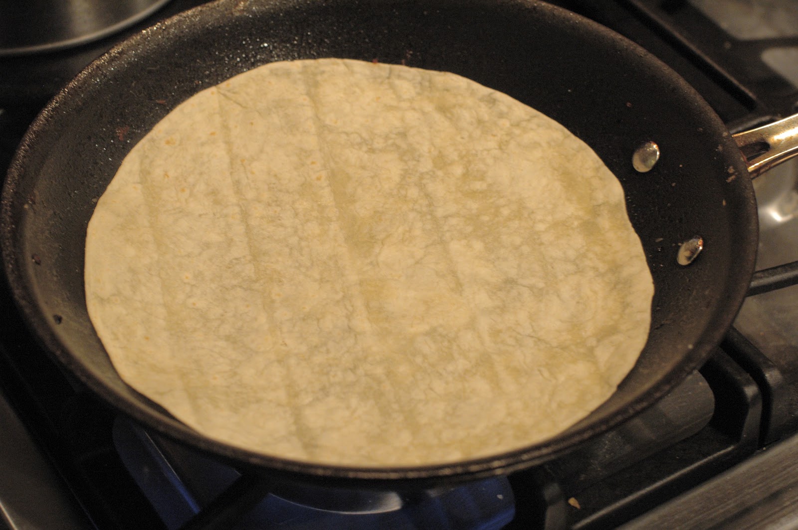 Place a tortilla in a skillet, on a burner turned to medium heat.